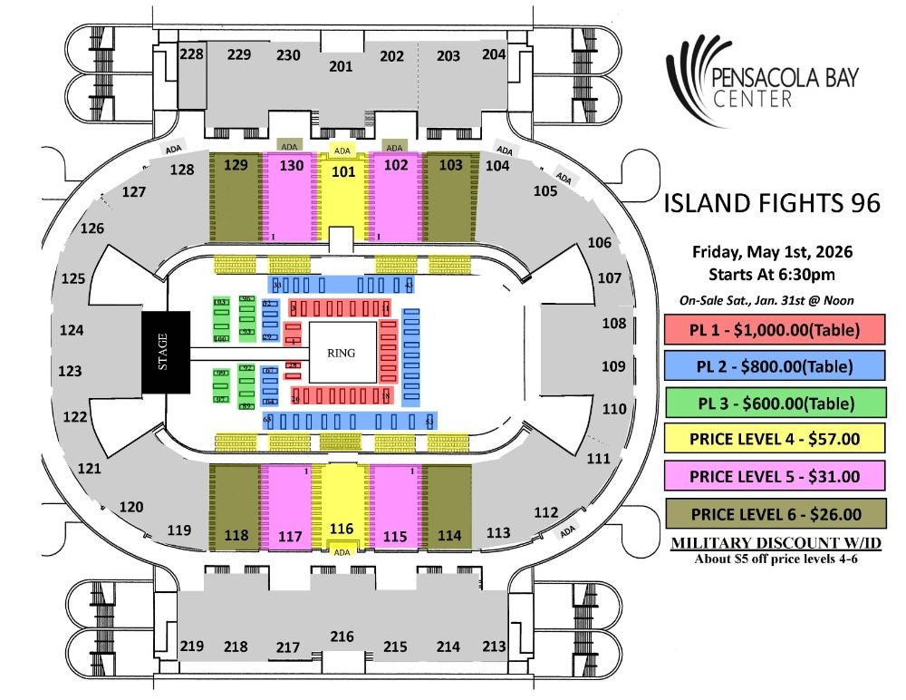 Don’t miss Island Fights 96 live on Friday, May 1st, at the Pensacola Bay Center! *Fights to be announced and subject to change*