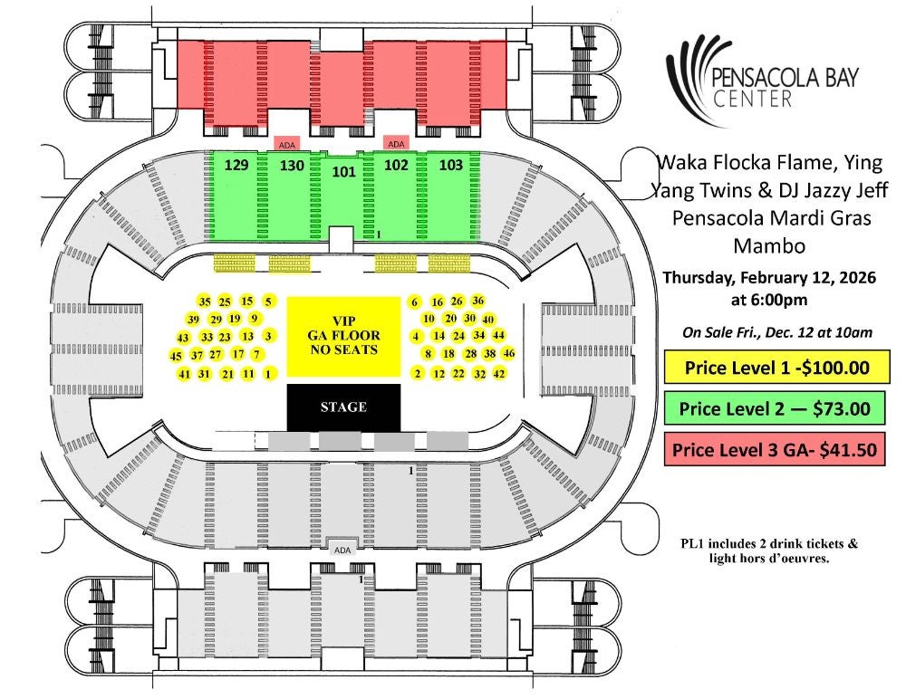 Experience the excitement of Mardi Gras like never before with the Pensacola Mardi Gras Mambo 2026 at the Pensacola Bay Center. This year's lineup brings together chart topping rapper Waka Flocka Flame, hip-hop duo Ying Yang Twins, and iconic DJ and producer DJ Jazzy Jeff for an unforgettable night of music and celebration! Join us on February 12, 2026, for a high-energy event filled with festive fliar, top-tier performances, and the spirit of Mardi Gras in the heart of Pensacola, FL!